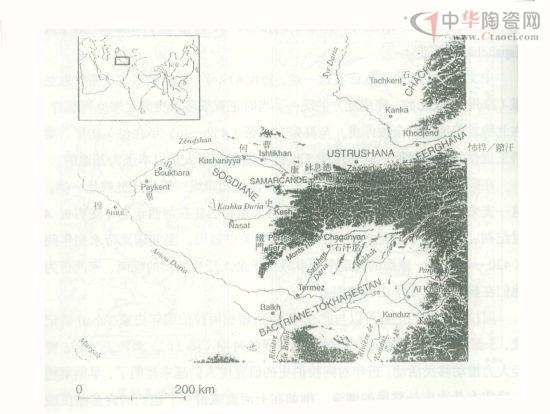 從岳州窯燒造胡人俑的外貌和裝束來看,均是來自西域的胡人。當時來自西域的胡人主要是沿著絲綢之路而來的粟特人、波斯人、大食人(阿拉伯人)。粟特人是居住在中亞拉姆河與錫爾河之間的澤拉夫善河流域(今烏茲別克斯坦)(圖12)的半農(nóng)半商民族,建有康國、安國、米國、史國、曹國、何國等城邦國家。該民族善于經(jīng)商,利之所在,無所不到,男子年二十,便遠赴他國,四處經(jīng)營。他們正是以通商的方式叩開了往返于中華的大門。粟特人是個有意思的民族,有著自己的宗教信仰和獨特習(xí)俗。在宗教方面,他們信仰火祆教。在婚姻上,可以“納母及姊妹為妻”。在喪葬制度上,火祆教經(jīng)典《阿維斯陀經(jīng)》規(guī)定,人死后,其尸體讓狗噬鳥啄;《西蕃記》記載:康國在城外,“別筑一院,院內(nèi)養(yǎng)狗。每有人死,即往取尸,置此院內(nèi),令狗食人肉盡,收骸骨埋殯”。波斯人是生活在伊朗地區(qū)的古老民族,建立了薩珊王朝(226年~650年)。自古以來,波斯與我國友好往來,《魏書》記載,波斯使臣來中國交聘達數(shù)十次之多,給北魏皇帝帶來的各種禮品中有各種珠寶、馴象等。薩珊王朝被阿拉伯帝國滅后,大部分波斯人伊斯蘭化,少量的波斯人來到唐土,如末代薩珊王朝國王的兒子俾路斯東逃至唐朝,在唐高宗時任右武衛(wèi)將軍。阿拉伯帝國滅掉波斯人和粟特人建立的政權(quán)后,完全控制了中亞地區(qū),成為與唐王朝經(jīng)濟文化往來的主要西域胡人。
