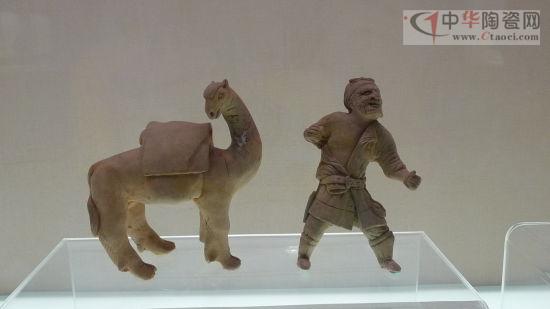 胡人俑,陶質(zhì),高18厘米。深目高鼻,滿臉絡(luò)腮胡須,頭系幞巾,身著緊身翻領(lǐng)窄袖衣,右肩袒露,腰間系革帶,帶上掛腰刀等物什,腳穿長筒靴。胡人飽受風(fēng)沙,滿臉滄桑,道道皺紋,清晰可見。他右手挽起,身體前傾,似在拽著駱駝前行。而載著貨物的駱駝卻作回首狀,好像在逗樂主人,一副溫順可愛、又調(diào)皮搗蛋的模樣。駱駝俑也為陶質(zhì),高18.5厘米,長17厘米。駱駝和胡人常常成組出現(xiàn),杜甫《寓目》:“胡兒掣駱駝”,駱駝與胡人的組合反映出我國與西亞各國頻繁的貿(mào)易往來和文化交流。