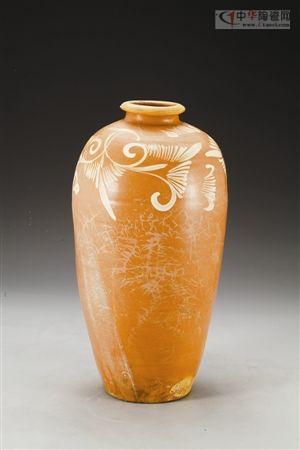 明代大同地區(qū)窯場(chǎng) 黑褐釉貼草葉紋缸
