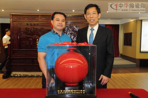 圖為巫楊金(左)代表福建富貴紅公司向大公報(bào)111周年慶;顒(dòng)贈(zèng)送紀(jì)念品。右為大公報(bào)董事長(zhǎng)兼社長(zhǎng)姜在忠。