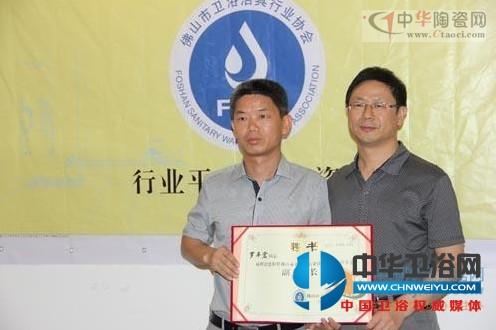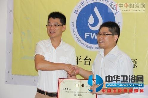 佛山市衛(wèi)浴潔具行業(yè)協(xié)會(huì)名譽(yù)會(huì)長(zhǎng)嚴(yán)邦平(右二)為中國(guó)陶瓷家居網(wǎng)運(yùn)營(yíng)總經(jīng)理羅平宏(右一)頒發(fā)聘書