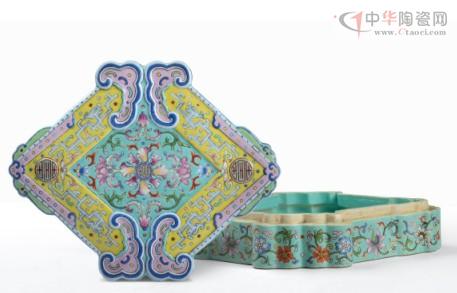 乾隆時(shí)期御窯瓷藝精進(jìn),集歷代名窯良器之精萃,借以御窯廠(chǎng)之能工巧匠,勇于創(chuàng)新。此件粉彩花卉紋如意菱形蓋盒,作品尊貴秀雅,裝飾雍容華麗,雋逸秀美,彩繪裝飾頗具特色。通體以翠綠彩為地,蓋面四柄如意兩兩相交組成菱形。如意施以黃彩,其上繪夔龍紋及團(tuán)壽紋,蓋心及蓋盒沿面繪以各式綻放洋花,枝蔓舒卷自如,設(shè)色淡雅清新,盡現(xiàn)乾隆彩瓷之尊貴雍容。整器繪畫(huà)精細(xì)入微,氣韻婉約雅致并流露出西洋之氣息,于清新中復(fù)見(jiàn)華貴,溫和并蘊(yùn)含富麗。