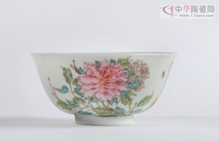 花事是古代文人雅士重要的怡情活動(dòng)之一,對(duì)各式花材的品評(píng)、選擇均有嚴(yán)格的標(biāo)準(zhǔn),雍正皇帝對(duì)此非常精通,講究組合之美,追求自然清新之唯美境界。因此雍正一朝宮廷諸項(xiàng)工藝品中,凡有花卉題材者,均是工筆寫(xiě)真,形神俱佳,氣韻清雅脫俗。特別是雍正時(shí)期的粉彩瓷器清雅怡人,歷來(lái)為藏家所珍視,正如《陶雅》中所說(shuō):“粉彩以雍正朝為最美,前無(wú)古人,后無(wú)來(lái)者,鮮妍奪目,工致殊常”。拍品清.雍正粉彩牡丹紋碗,胎薄體輕,釉面似玉般溫潤(rùn)細(xì)膩,更能突出線(xiàn)條纖細(xì)、色彩柔和的紋飾之美。拍品造型雋秀端莊,外壁粉彩繪牡丹、芍藥、菊花等簇?fù)矶,花枝橫向延伸,葉片寬大,牡丹豐碩紅艷,芍藥飽滿(mǎn)淡雅,蜜蜂飛舞其間,一派欣欣向榮之景象。畫(huà)筆清秀細(xì)膩,設(shè)色淡雅逸麗,仿若春風(fēng)拂面,醉人心扉。