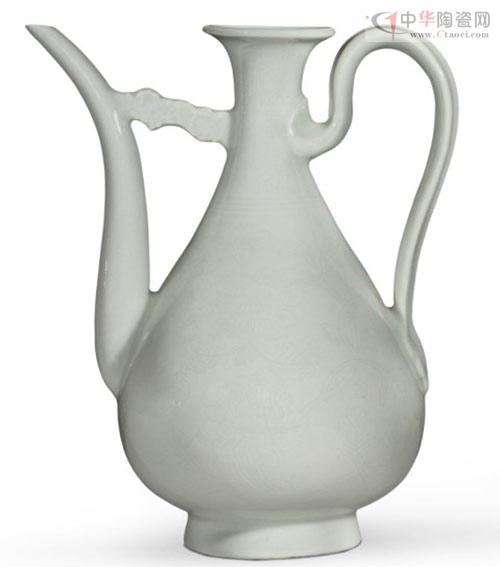 眾所周知,甜白釉以明代永樂(lè)窯生產(chǎn)的最為著名。永樂(lè)白釉大多達(dá)到脫胎、薄胎的程度。尤其是脫胎制作工藝極其復(fù)雜,大約需要幾十道工序。甜白釉釉極瑩潤(rùn),能照見(jiàn)人影,給人以溫柔甜凈之感,所以稱(chēng)為甜白,素有“白如凝脂,素猶積雪”之譽(yù)。本次春拍瓷器專(zhuān)場(chǎng)中,一件明.永樂(lè)甜白釉暗刻花卉紋把壺,堪稱(chēng)精品之冠。壺身呈玉壺春瓶式樣,腹一側(cè)設(shè)長(zhǎng)彎流,流與頸之間以云形板連接,美觀實(shí)用,設(shè)計(jì)巧妙;另一側(cè)置曲形柄,器型線(xiàn)條復(fù)雜多變,雍容秀美。通體施白釉,溫潤(rùn)潔凈,嬌嫩悅目,質(zhì)如堆脂。釉下細(xì)線(xiàn)錐刻花紋,紋飾清晰生動(dòng),氣韻流暢,盡現(xiàn)永樂(lè)御瓷纖巧柔美之風(fēng)姿。