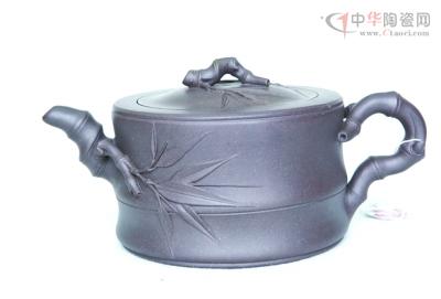 他的紫大竹提梁壺,泥色近如成竹,壺身飽滿挺拔,以竹節(jié)制成壺嘴,並綴一小竹枝於壺體,疏密有致﹔竹葉如風(fēng)吹拂,以曲折的帶葉的小竹根作為壺蓋的紐,以細竹枝彎成方中見圓的提梁,竹節(jié)的紋理、竹芽的點綴都顯示出細膩逼真的效果。另一件代表作提梁弧棱壺,更顯示了吳雲(yún)根對方圓之道的領(lǐng)悟。壺的主體為弧棱,壺把改為平式提梁,方中有圓、圓方互濟、相得益彰。既體現(xiàn)了虛與實、圓與方的對比效果,又彰顯了中國古代儒道學(xué)說的精神。