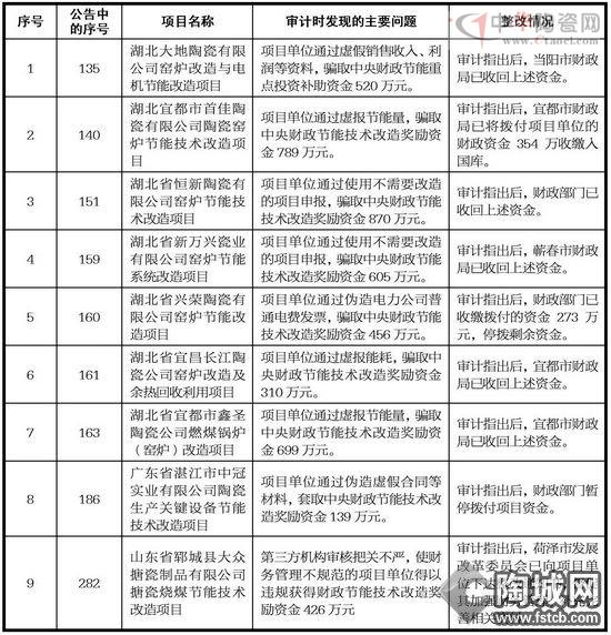“三款科目資金”審計(jì)結(jié)果顯示,云南省曲靖市石林錦達(dá)瓷業(yè)有限公司、湖北省宜昌長江陶瓷公司、湖北宜都市首佳陶瓷有限公司、湖北大地陶瓷有限公司、湖北省興榮陶瓷有限公司、湖北省恒新陶瓷有限公司、湖北省鄂州中冠陶瓷有限公司、湖北陶星陶瓷科技有限公司、湖北省宜都市鑫圣陶瓷公司、湖北省新萬興瓷業(yè)有限公司、廣東省湛江市中冠實(shí)業(yè)有限公司、廣東潮州時(shí)尚衛(wèi)浴實(shí)業(yè)有限公司以及山東省鄆城縣大眾搪瓷制品有限公司等14家國內(nèi)陶瓷衛(wèi)浴產(chǎn)業(yè)機(jī)構(gòu),利用窯爐、噴霧塔、電機(jī)設(shè)備以及余熱(尾氣)回收利用等節(jié)能改造項(xiàng)目,共騙取中央獎(jiǎng)勵(lì)資金高達(dá)7392.83萬元,約占報(bào)告總體涉案金額的4.6%,現(xiàn)已收回違規(guī)資金3631萬元,回收率尚不足50%。