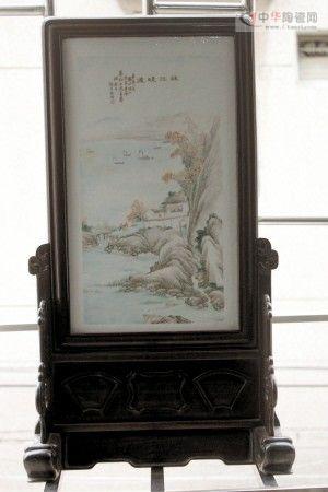 岑世英藏有一件汪野亭落款的瓷版畫插屏。記者在其家里看到,這件瓷版插屏配以酸枝木架,瓷面繪有山水風(fēng)景,落款為汪野亭,年份為辛酉年。瓷畫的長(zhǎng)為43厘米,寬為25厘米。岑世英告訴記者,這件瓷版畫插屏是清代著名的瓷畫名家“珠山八友”當(dāng)中汪野亭的早期作品。