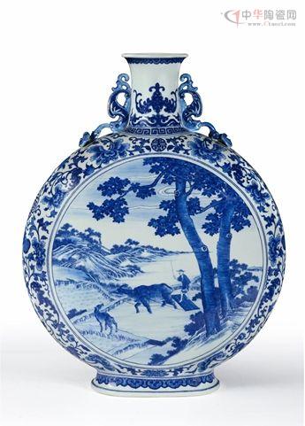 清乾隆 青花春耕圖雙福如意耳特大抱月瓶 高:59公分