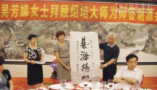 席間舉行了簡(jiǎn)單的拜師儀式,徒弟吳芳娣向師傅顧紹培夫婦執(zhí)弟子禮(鞠躬、敬茶、獻(xiàn)花籃),顧大師向愛徒回贈(zèng)書畫真跡,并作即席講話,談到和吳芳娣師徒之間的淵源和緣份,源于顧大師對(duì)出生地洋渚村紫砂產(chǎn)業(yè)的扶持與關(guān)愛,顧紹培大師高風(fēng)亮節(jié)、毫無保留的藝德和風(fēng)趣幽默的語(yǔ)氣,贏得了在座的陣陣掌聲,人家問他,你最好的作品是什么?他說:"我最好的作品是徒弟"。宜興市陶瓷行業(yè)協(xié)會(huì)會(huì)長(zhǎng)史俊棠也作了簡(jiǎn)短的講話,"宜興近幾年拜師學(xué)藝蔚然成風(fēng),成為一種現(xiàn)象,這是一種正能量的體現(xiàn),因?yàn)槊耖g技藝自古就是師徒之間心傳口授,手把手傳幫帶"。最后紫砂發(fā)源地洋渚村村書記顧進(jìn)華作了熱情洋溢的講話。