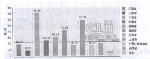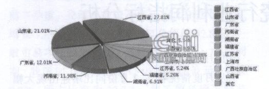 2013年1-9月陶瓷行業(yè)完成利潤(rùn)總額前四位的地區(qū)一次是江西、山東、廣東、河南,其中江西累計(jì)完成利潤(rùn)總額同比增長(zhǎng)18.32%,占27.81%;山東累計(jì)同比增長(zhǎng)8.13%,占21.01%。詳見圖4.