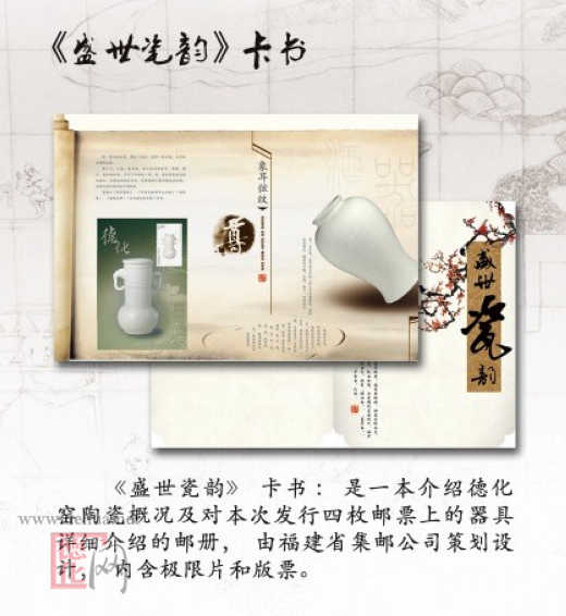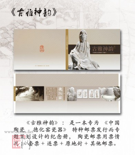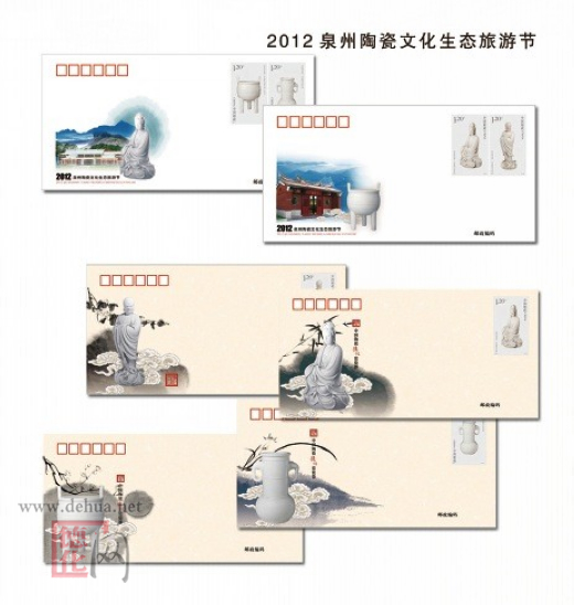 《中國陶瓷-德化窯瓷器》特種郵票于2012年10月20日隆重發(fā)行。限量發(fā)行《中國瓷都.德化》郵票珍藏紀(jì)念冊、《瓷國明珠》郵票珍藏紀(jì)念冊、《盛世瓷韻》卡書折、《古雅神韻》—德化窯瓷器首發(fā)式專題冊、《瓷國明珠.大師風(fēng)采》、《瓷國明珠.品牌企業(yè)》——首發(fā)式紀(jì)念郵冊、《中國陶瓷》郵票珍藏紀(jì)念冊、原地封、原地極限片、極限片、鎮(zhèn)紙、純金、純銀郵票等。