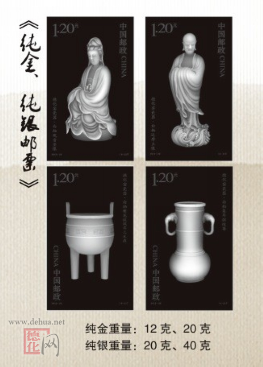 中國郵政于2012年10月20日發(fā)行《中國陶瓷——德化窯瓷器》特種郵票1套4枚。詳情如下: