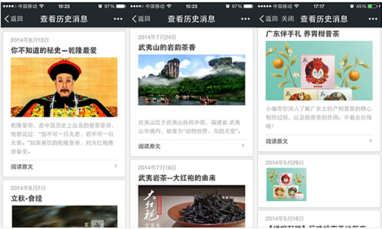 由廣州玩味工藝品有限公司運(yùn)營的公眾號“玩味禮品”是一家集設(shè)計、開發(fā)、銷售、服務(wù)于一體的公司。目前產(chǎn)品以紙制品為主,包括各類筆記本、創(chuàng)意文化用品以及商務(wù)禮儀禮品等。該微信從乾隆的喝茶秘史到儒、道、佛家語茶文化的淵源介紹,用“文化”做切入點(diǎn),輔以節(jié)假日相關(guān)活動及茶禮,有效推動了微信目標(biāo)用戶的關(guān)注。
