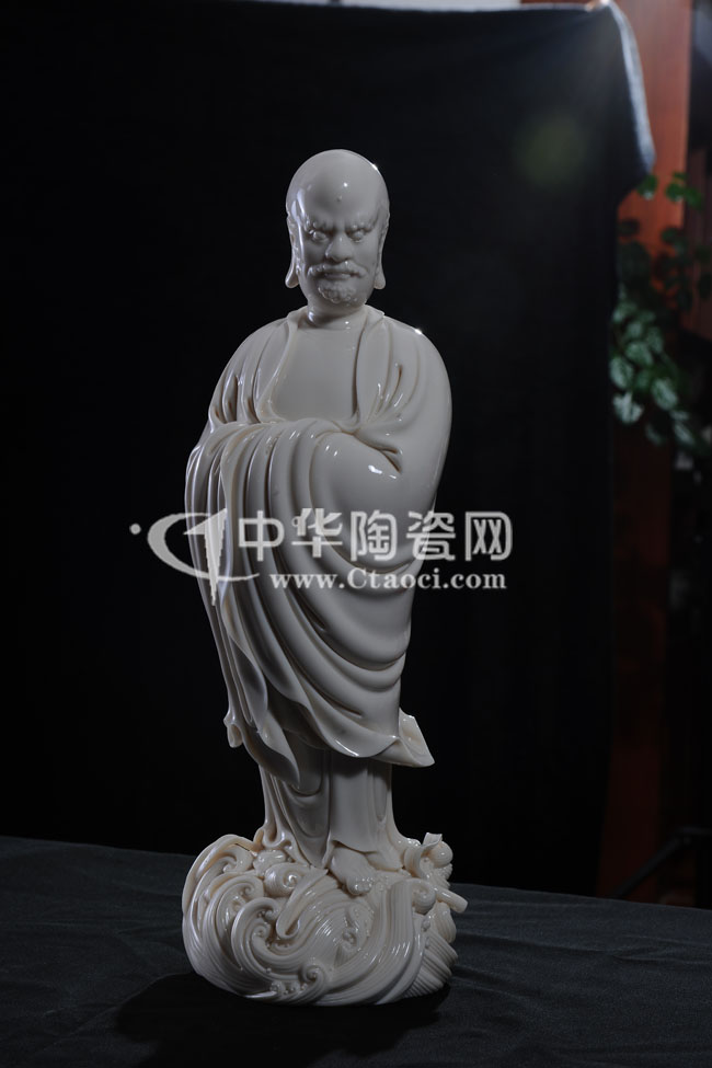 連紫華是中國國家博物館建館以來首個(gè)在此舉辦個(gè)展的中國陶瓷藝術(shù)家。出生在瓷都德化的連紫華是福建省工藝美術(shù)大師、福建省陶瓷藝術(shù)大師。多年來,他沉浸于繼承弘揚(yáng)傳統(tǒng)瓷雕藝術(shù),潛心于“中國白”瓷雕藝術(shù)的傳承與創(chuàng)作,專注于德化陶瓷雕塑傳統(tǒng)題材——佛教人物造像的研究與創(chuàng)作,在吸收借鑒中外雕塑藝術(shù)精華的同時(shí),又融匯了文化、藝術(shù)、科技等元素,將傳統(tǒng)與現(xiàn)代的技法交融運(yùn)用,增加作品的動感、韻律、節(jié)奏、線條等藝術(shù)因素,在保留傳統(tǒng)技法的魅力的基礎(chǔ)上,塑造出與現(xiàn)代審美情趣相結(jié)合的思想內(nèi)涵和個(gè)性,實(shí)現(xiàn)了對德化傳統(tǒng)瓷雕的發(fā)展和突破,形成了形神兼?zhèn)、精雕?xì)刻、優(yōu)美傳神,頗具明代雕塑大師何朝宗的藝術(shù)之風(fēng)。