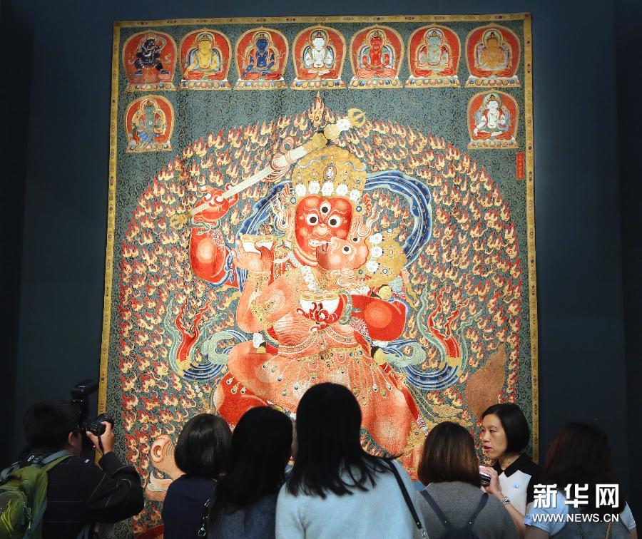 11月21日,香港佳士得專家在重要中國(guó)瓷器及工藝精品2014年秋拍預(yù)展上介紹焦點(diǎn)拍品明永樂(lè)御制紅閻摩敵刺繡唐卡,估價(jià)逾8000萬(wàn)港元。