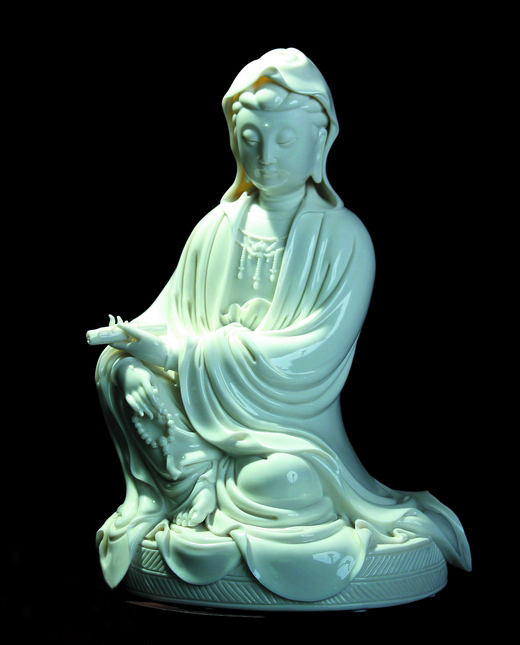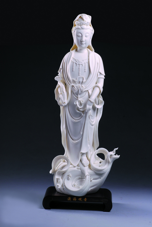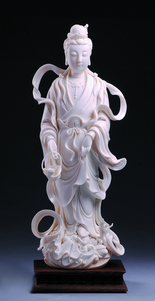 作品《魚籃觀音》便深具林吉祥自己的標簽。觀音赤足站立荷葉之上,下承水浪激涌,胸飾珠串,著通肩衣袍,右手提籃,左手持裙,垂目肅靜安詳。這件作品最引人注目的除了觀音面部的恬靜安詳、氣韻生動以外,還有其周身環(huán)繞的長飄帶。這些長飄帶不但燒制困難,更能充分發(fā)揮出線條對人物造型的重要作用,“以線刻體、以體托線、線體結(jié)合”,烘托出人物的精神氣質(zhì)和內(nèi)在性格,表現(xiàn)出一種細膩、纖巧的形式美。