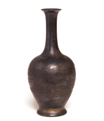 據(jù)悉,深圳御寶軒正在展出一件烏金釉金彩凈瓶,瓶高14.4cm,口徑2.8cm,底徑4.4cm。器形規(guī)整,撇口弧腹圈足,瓶口黑釉自然流淌。烏金釉碗胎質堅實,釉面瑩潤烏黑,有玉質感,釉光內(nèi)斂。遠看器物烏黑瑩潤,近看則釉面有不同層次的細微變化,不是一色“死黑”,呈現(xiàn)出如窯變釉般的效果。細觀之,凈瓶釉面部分有蛛絲網(wǎng)般細紋凸起,非常值得慢慢品味、把玩!