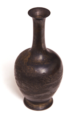凈瓶又叫軍持,起源于佛教的發(fā)源地印度,后隨佛教傳入中國,是佛教僧侶隨身攜帶的用于貯水凈手用的器皿。凈瓶小口長頸,是一種宗教徒常用的器物,亦稱“軍持”,始于唐,盛于宋元。宋代造型,瓶上部有直立的細長圓管,肩部一側有上翹短流,也有配以龍頭流的。明清時期,肩腹間安有乳房狀流,瓶口的注口均加蓋,腹部圓肥。此凈瓶顏色古雅,金彩點綴,柔潤光滑,撫之如觸嬰兒肌膚,制作細膩,精美絕倫。
