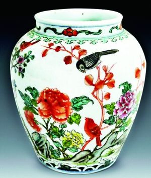 這個明代五彩花鳥紋瓷罐,高25厘米,罐腹四面以不同的花鳥題材構(gòu)成裝飾主題,畫中各式花卉競相綻放,姹紫嫣紅,淡淡的花香吸引著鳥兒棲身花枝上。整個畫面給人感覺出濃濃春意撲面而來,一派春意盎然的自然景象。