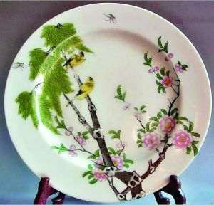 粉彩瓷又叫軟彩瓷,景德鎮(zhèn)窯四大傳統(tǒng)名瓷之一。粉彩是一種釉上彩繪經(jīng)低溫?zé)傻牟世L方法。粉彩瓷器是清康熙晚期在五彩瓷基礎(chǔ)上,受琺瑯彩瓷制作工藝的影響而創(chuàng)造的一種釉上彩新品種。這件民國粉彩柳樹黃鶯盤,直徑25.2厘米,上繪柳樹黃鶯圖。粗壯的柳樹,纖細的桃枝,柳樹枝葉茂盛,桃枝花朵綻放,兩只黃鶯立在柳樹枝頭朝遠方鳴叫,像是在歡呼春天的到來。不遠處蝴蝶翩翩飛舞,讓人感到了春意濃濃,心曠神怡。此盤瓷質(zhì)潔白細膩,造型舒展大方。