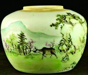 絳彩瓷是清末時景德鎮(zhèn)具有創(chuàng)新意義的釉上彩新品種。絳彩瓷中的“淺絳”,特指晚清至民國初流行的一種以濃淡相間的黑色釉上彩料,在瓷胎上繪出花紋,再染以淡赭和水綠、草綠、淡藍及紫色等,經(jīng)低溫(650℃~700℃)燒成的一種特有的低溫彩釉。這件清代光緒淺絳彩童子牧牛圖瓷壺,高10厘米。造型古樸大方,胎質(zhì)縝密,釉色瑩潤,通體施白釉,器身繪有牧牛圖?,牧童雙手用力,拉著韁繩,憨牛倔強頑皮,不肯屈就。背景綠草茵茵,綠樹蔥蘢,鮮花爛漫,春意盎然。圖案線條美觀,繪飾精致,構(gòu)圖疏朗,勾描精細。