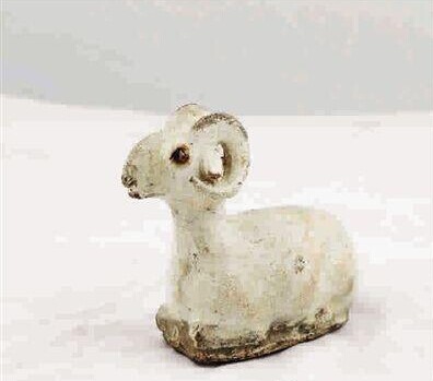 這尊宋代登封窯吉羊,淡雅純凈,厚實穩(wěn)當,工藝嫻熟;底露胎骨,胎為灰色,釉不及底,掛釉痕跡明顯,底部還有一出氣洞,與當時的燒制工藝一致。它高10厘米,寬10、5厘米,通體施白釉,微泛黃,用化妝土敷底,釉面布滿開片細紋,大大的羊角自然彎曲,雙耳垂直,嘴巴微張,鼻梁露孔,目點褐彩,脖頸粗壯。