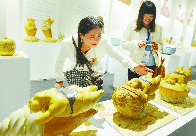 3月27日,2015中國陶瓷藝術大展暨首屆湖南(醴陵)陶瓷博覽會長沙望城銅官窯展區(qū),參觀者饒有興致地觀看展品。湖南日報記者 徐行 攝