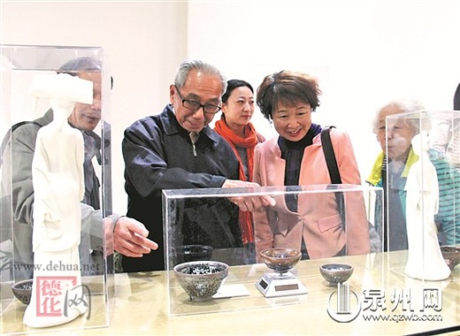 近日,在晉江五店市傳統(tǒng)街區(qū),來自德化的白瓷與來自建陽的建盞一同展出,進行一場白瓷與黑瓷的無聲對話。圖為廈門大學知名考古及陶瓷鑒定專家葉文程教