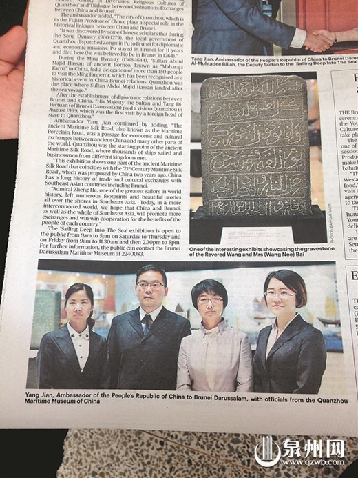 “通過此次展覽,泉州在文知名度和影響力得到了有力提升。”吳燕玲說,早在開展前,文萊媒體就對事件進(jìn)行了持續(xù)追蹤的報(bào)道。直至工作人員回國的26日,文萊航班上發(fā)放的當(dāng)天主流報(bào)紙中仍在報(bào)道關(guān)于泉州“海絲”展覽消息。