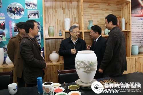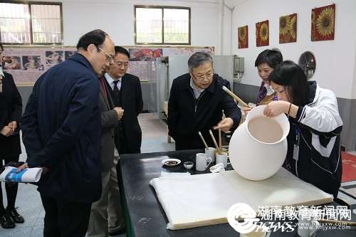 王廳長(zhǎng)一行首先視察了校園環(huán)境,對(duì)學(xué)校一流完善的辦學(xué)條件很是滿(mǎn)意。在學(xué)校大漢陶瓷體驗(yàn)館,王廳長(zhǎng)觀看了陶瓷大師們的精彩創(chuàng)作過(guò)程,不時(shí)與大師們進(jìn)行親切交談,熱情地詢(xún)問(wèn)大師們一些問(wèn)題?吹酵瑢W(xué)們正認(rèn)真地創(chuàng)作非常美麗的陶瓷作品時(shí),王廳長(zhǎng)對(duì)他們進(jìn)行了高度的贊揚(yáng),不斷地鼓勵(lì)他們勤學(xué)苦練、立志志才。他對(duì)醴陵陶瓷興趣濃厚,在國(guó)瓷展廳,對(duì)琳瑯滿(mǎn)目的國(guó)瓷展品給予了高度的評(píng)價(jià),表示今后一定會(huì)更多地了解醴陵陶瓷文化、陶瓷歷史。