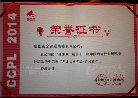 2015年3月28日,第十一屆中國陶瓷行業(yè)新銳榜頒獎典禮暨中國制造•佛山論壇在佛山新媒體產(chǎn)業(yè)園隆重舉行。金達雅陶瓷原創(chuàng)糖果釉瓷磚憑其全新技術,閃亮肌理喜獲“年度優(yōu)秀產(chǎn)品(瓷磚類)”大獎,成為中國陶瓷行業(yè)2015年陶瓷新品中亮眼之星。