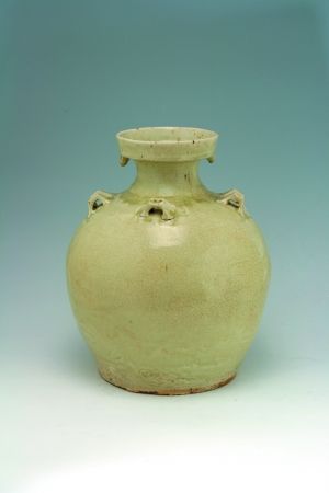 盤口、直頸、豐肩、園鼓腹、平底;盤口下對稱有兩條小系,肩上四面有六條橋型系,呈兩雙兩單狀排列;通體施青釉,釉層肥厚潤澤,開有細密的深色紋片,積釉處呈綠色;平底無釉露淺灰色胎,胎質較為酥松有孔洞。