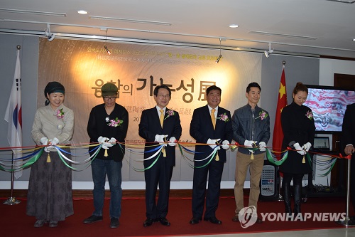 韓國(guó)陶瓷財(cái)團(tuán)代表理事李完熙(左三)和首爾中國(guó)文化中心主任史瑞琳(右三)出席活動(dòng)并剪彩。(韓聯(lián)社)