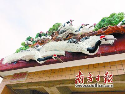 饒平縣黃岡鎮(zhèn)寨上社區(qū),一片水泥房住宅中,有一間民宅屋頂顯得“鶴立雞群”—屋頂真有88只瓷“鶴”棲息在瓷做的松樹上,這幅圖是屋主蔡炳烈用3000個(gè)瓷