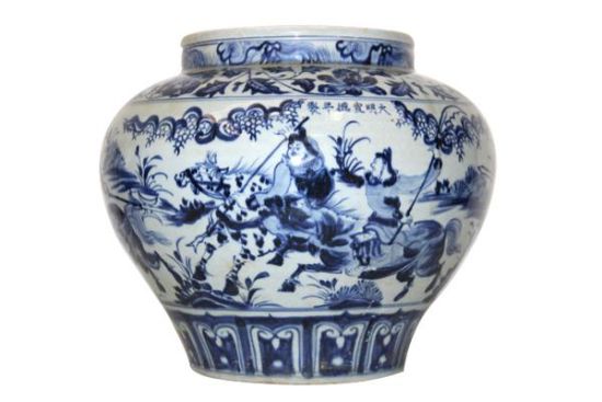 本公司最近有幸征集到一款瓷器珍品“人物故事紋青花大罐”,藏品高:32cm,口徑:20.9cm,底徑:9cm。藏品為豐肩、圓腹、下收、底足修削細(xì)膩。藏品是一只精致的青花人物故事大罐,器型規(guī)整,胎質(zhì)細(xì)密堅(jiān)實(shí),釉水瑩潤(rùn),包漿一流,發(fā)色濃淡有序,清麗暢快。青花發(fā)色鮮艷,筆法流暢,人物栩栩如生,形態(tài)各異,充滿濃厚的人文氣息。