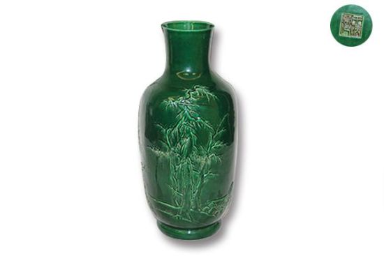 本公司最近有幸征集到一款瓷器珍品“王炳榮款綠釉賞瓶”,藏品高:46cm,底徑:14cm,口徑:11cm。整體施綠釉,瓶身上用瓷雕的方法描繪了一幅智者在樹之下沉思的景象。底部正中有圖章款一方,印文篆書陽刻,外加方形圈,款識為“王炳榮作”四字。器物頗具晚清時代特征,精致秀美,畫面生動自然,技法多種并用,色彩明快淡雅,有較強(qiáng)的寫實(shí)性和較高的藝術(shù)性,是一件不曾多見的瓷器藝術(shù)品。