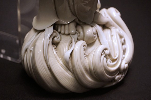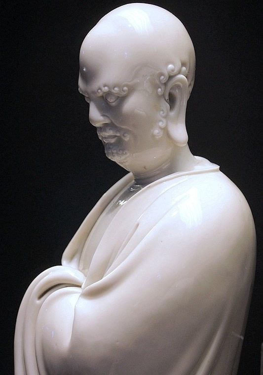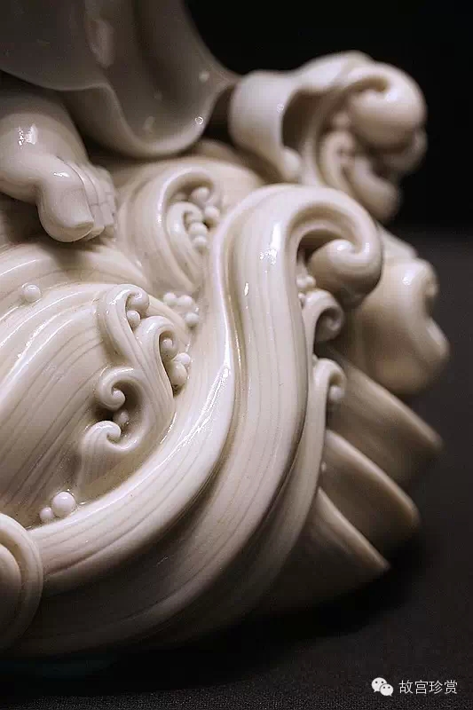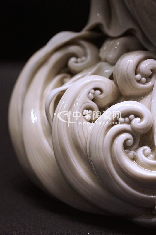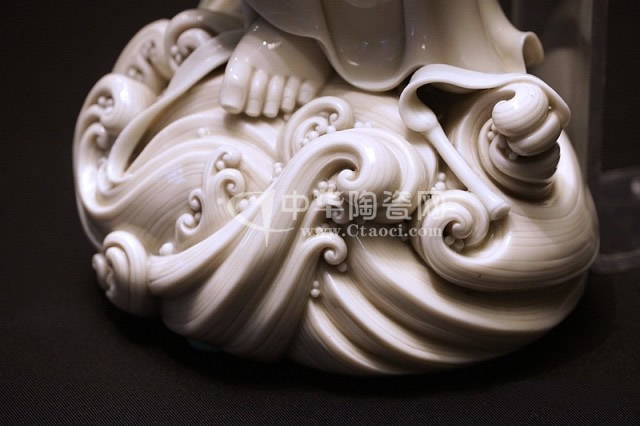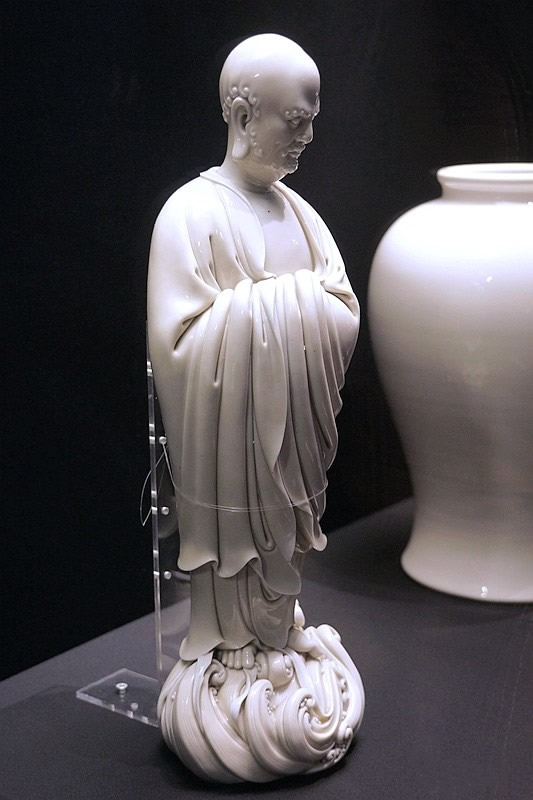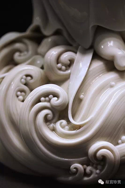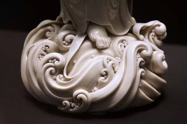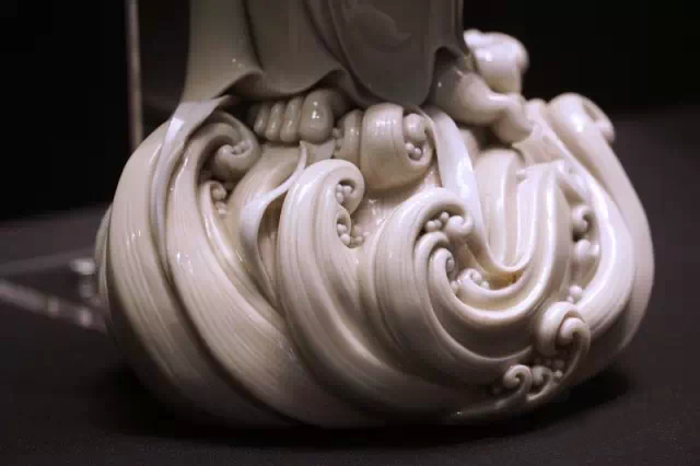 而何朝宗最為精彩的傳世瓷塑名作《達摩立像》,這件立像與其他德化窯瓷塑人物一樣,體量不大。但卻將波濤之上一葦渡江的達摩表現(xiàn)得維妙維肖。何朝宗所作此像,在精準優(yōu)美的人物形象塑造和令人叫絕的衣紋水波再現(xiàn)之外,正所謂——妙不可言。