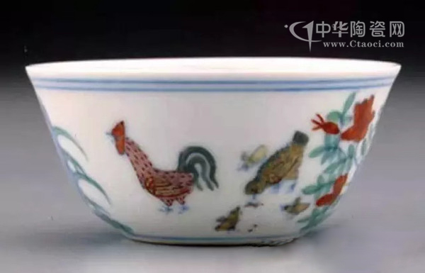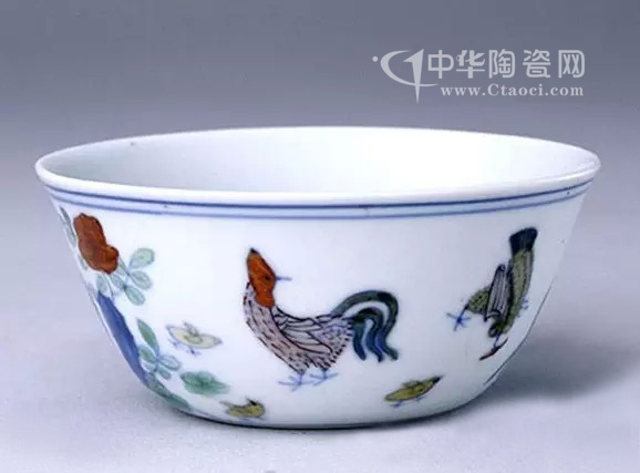 杯體小巧,輪廓線柔韌,呈現(xiàn)出端莊婉麗、清雅雋秀的風韻。杯外壁飾子母雞兩群,間以湖石、月季與幽蘭,一派初春景象。底心青花雙方欄內楷書“大明成化年制”雙行六字款。