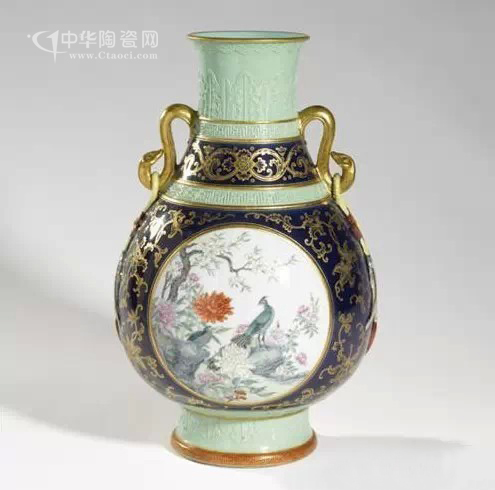 八、霽藍描金開光粉彩花鳥暗刻松石綠釉如意雙耳尊民國粉彩雙耳尊