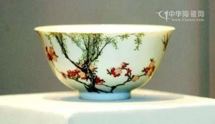 這件瓷器是張永珍在2006年拍得,是清乾隆御制琺瑯彩瓷器中十分具有代表的作品。該碗側面有乾隆御筆行楷題詩:“玉剪穿花過,霓裳帶月歸”,碗底有藍楷書款《乾隆年制》。該碗造型秀美,白釉溫潤,工藝精湛,乃為乾隆琺瑯彩瓷器杰作。