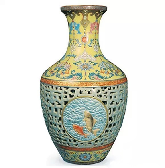 瓶身鯉魚圖栩栩如生,鏤空水波紋雕花設計大氣富貴,瓶頸上紅色“吉”字蘊含吉祥如意。據(jù)史料記載這也是我國古代制瓷史上設計最精巧、工藝最復雜的三種瓷器樣式之一。