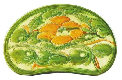 在這個(gè)瓷碗不遠(yuǎn)處,一批牡丹文物“集體”出現(xiàn)了:是宋代的瓷枕,包括珍珠地牡丹紋瓷枕和三彩牡丹紋枕等。據(jù)介紹,瓷枕最早出現(xiàn)于隋代,唐代以后開始批量生產(chǎn),北宋時(shí)期進(jìn)入繁榮期,造型很多,從實(shí)用品轉(zhuǎn)為藝術(shù)品。記者眼前的這個(gè)三彩枕長32厘米,寬19.5厘米,高11厘米,枕面飾單瓣棕黃色牡丹一朵,花蕊呈綠、白色,周飾綠色,光澤濃艷。