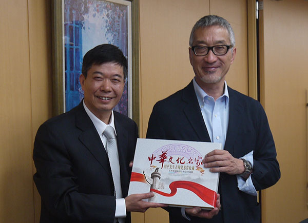 (圖為胡平向日本大阪產(chǎn)業(yè)大學校長瀨島順一郎贈送紀念冊)