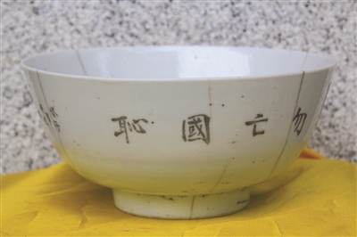 昨日上午,記者在云霄博物館見到了這兩件保存完好的抗戰(zhàn)文物。一件是民國粉彩“勿亡國恥”款描金牡丹花卉紋碗,直徑15厘米,高7厘米,底徑6.5厘米,上繪牡丹、菊花、梅花,以牡丹及蕊為主題花卉,少量描金。碗壁題楷書“勿亡國恥”,落款“癸酉年順記作”。瓷質(zhì)潔白細(xì)膩,胎體較輕薄,畫工精美,色彩亮麗,碗身有沖口七道,為民國22年(1933年)德化順記所作收藏佳品。
