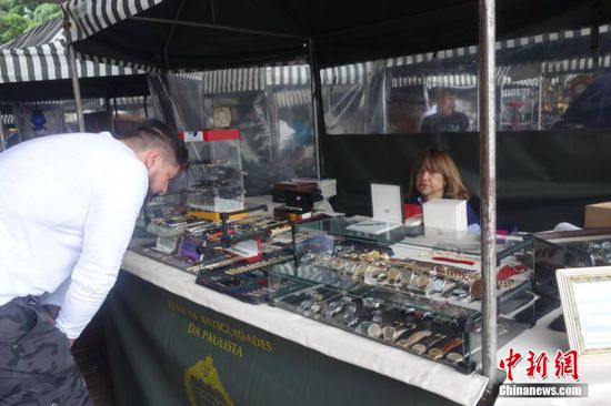 巴西圣保羅保利斯塔大街有一個周日古玩集市,只星期日開張,這里擺賣的古玩有瓷器、銀器、燈飾、舊款相機、老款留聲機、舊鐘表等,品類繁多,吸引了眾多顧客,生意紅火。圖為11月1日一位女顧客在一個根雕攤位前觀看。 中新社記者 莫成雄 攝巴西圣保羅保利斯塔大街有一個周日古玩集市,只星期日開張,這里擺賣的古玩有瓷器、銀器、燈飾、舊款相機、老款留聲機、舊鐘表等,品類繁多,吸引了眾多顧客,生意紅火。圖為:11月1日一位男顧客觀看一些舊式機械手表。