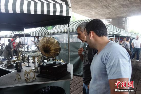 巴西圣保羅保利斯塔大街有一個周日古玩集市,只星期日開張,這里擺賣的古玩有瓷器、銀器、燈飾、舊款相機、老款留聲機、舊鐘表等,品類繁多,吸引了眾多顧客,生意紅火。圖為:11月1日一位男顧客觀看一些舊式機械手表。 中新社記者 莫成雄 攝巴西圣保羅保利斯塔大街有一個周日古玩集市,只星期日開張,這里擺賣的古玩有瓷器、銀器、燈飾、舊款相機、老款留聲機、舊鐘表等,品類繁多,吸引了眾多顧客,生意紅火。圖為:11月1日兩名顧客察看一款老式手搖留聲機。