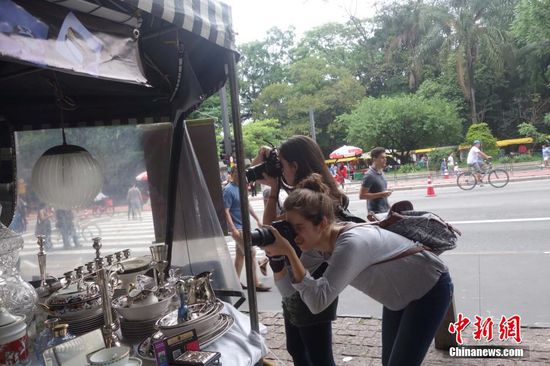 巴西圣保羅保利斯塔大街有一個周日古玩集市,只星期日開張,這里擺賣的古玩有瓷器、銀器、燈飾、舊款相機、老款留聲機、舊鐘表等,品類繁多,吸引了眾多顧客,生意紅火。圖為:11月1日一位顧客在一個舊款相機攤位前走過。 中新社記者 莫成雄 攝巴西圣保羅保利斯塔大街有一個周日古玩集市,只星期日開張,這里擺賣的古玩有瓷器、銀器、燈飾、舊款相機、老款留聲機、舊鐘表等,品類繁多,吸引了眾多顧客,生意紅火。圖為11月1日一位女顧客在一個根雕攤位前觀看。