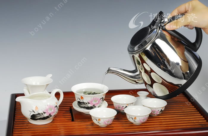 瓷質(zhì)茶具傳熱不快,保溫性能好,而且不會(huì)與茶發(fā)生化學(xué)反應(yīng),用來(lái)泡茶能夠很好地呈現(xiàn)出茶的色、香、味,實(shí)用性強(qiáng)。瓷質(zhì)茶具的造型豐富、美觀,裝飾精巧,圖案清新,具有藝術(shù)欣賞價(jià)值。在購(gòu)買瓷質(zhì)茶具時(shí),應(yīng)考慮其實(shí)用性、藝術(shù)性兼具。
