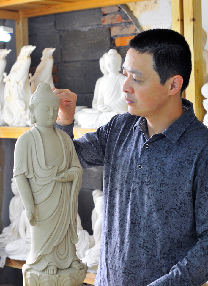 林建平,自幼酷愛陶瓷雕塑,10多年來專研于觀音、彌勒等傳統(tǒng)佛像,所創(chuàng)作的觀音形態(tài)各異,卻都不失莊嚴(yán)肅穆、慈愛祥和。