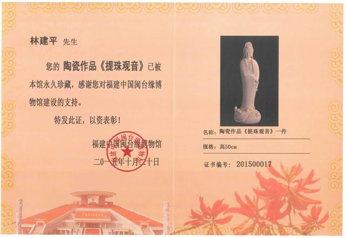 《提珠觀音》獲福建中國閩臺緣博物館收藏證書